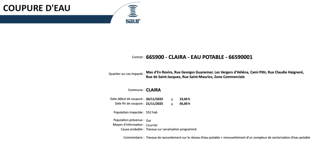 En raison de travaux sur une canalisation d’eau par Saur et d’une remise en état de la voirie